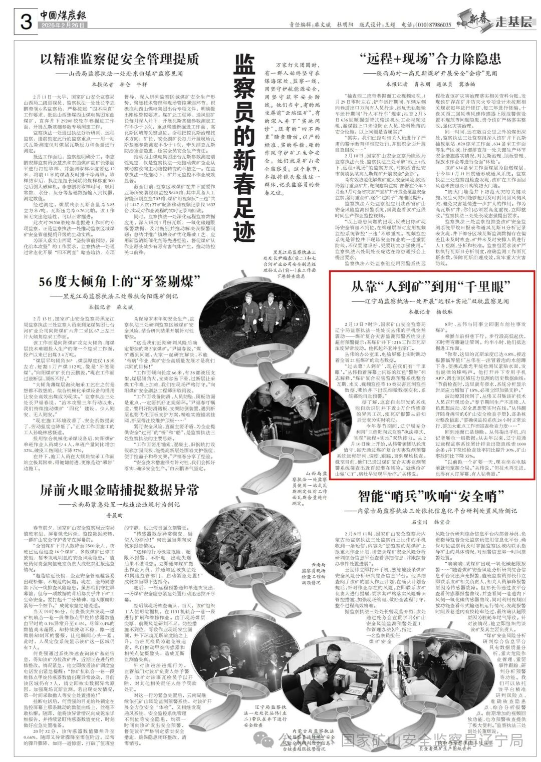 回到地面已是傍晚。叢偉掏出手機(jī),向記者展示一組數(shù)據(jù):從去年以來(lái),遼寧局通過(guò)遠(yuǎn)程監(jiān)察系統(tǒng)累計(jì)排查出隱患線索1000余條;井下現(xiàn)場(chǎng)檢查效率同比提升30%,礦山事故同比下降35%。