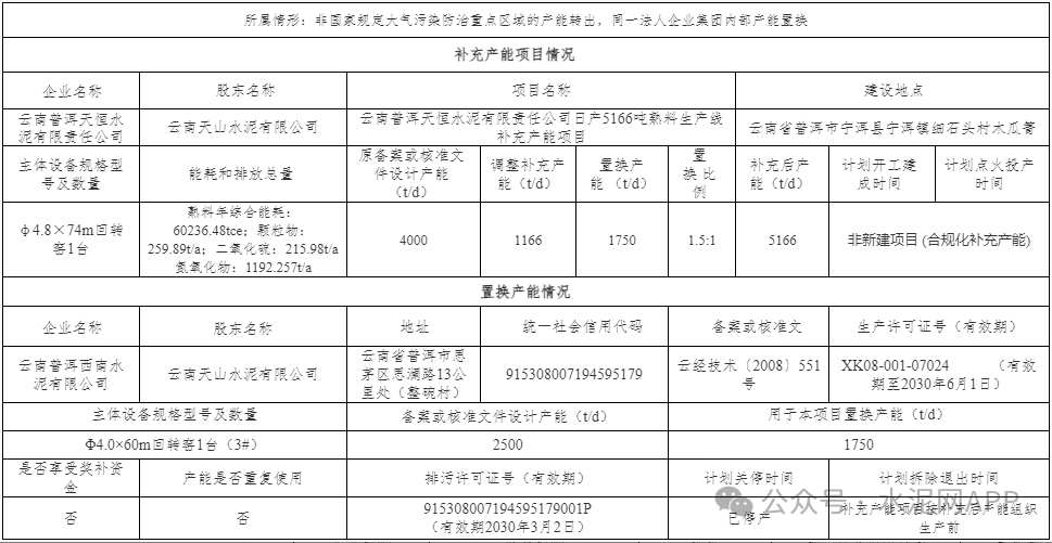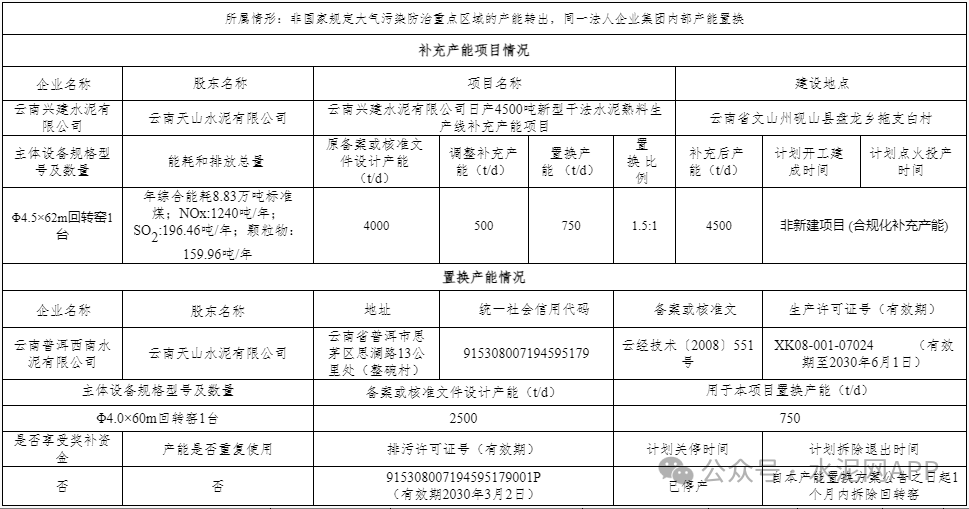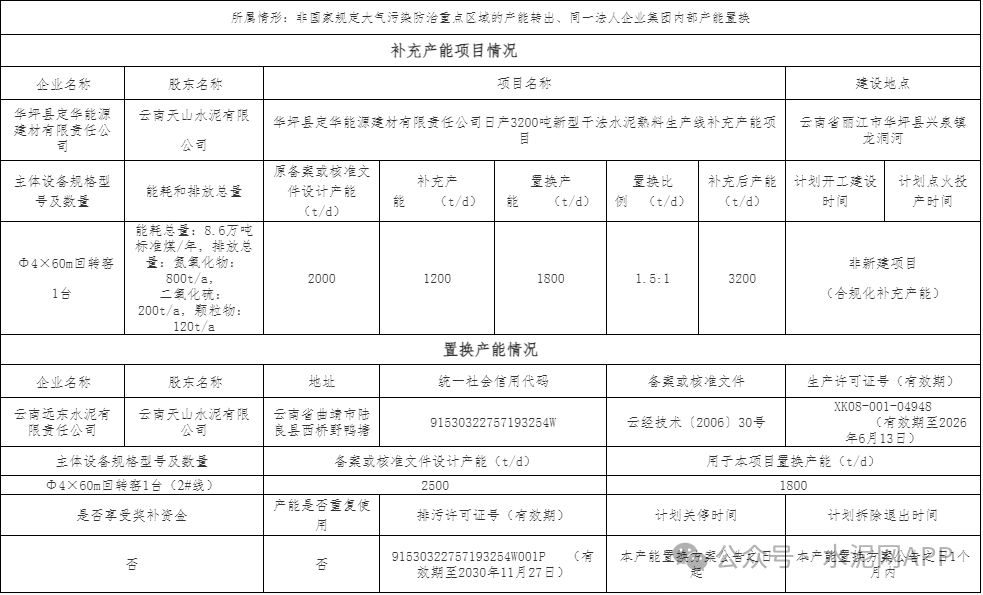 云南遠東水泥退出一條2500t/d熟料生產(chǎn)線,其中1800t/d產(chǎn)能用于補充華坪縣定華能源建材一條2000t/d熟料線,補齊后產(chǎn)能3200t/d。置換比例1.5:1。