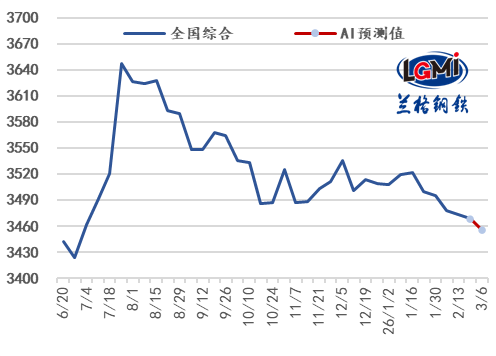 2026年第9周(2026.2.23-2.27)蘭格鋼鐵全國絕對價格指數(shù)為3469元,較節(jié)前下降0.1%,較去年同期下降5.6%;其中,蘭格鋼鐵長材絕對價格指數(shù)為3345元,與節(jié)前持平,較去年同期下降4.8%;蘭格鋼鐵型材絕對價格指數(shù)為3399元,與節(jié)前持平,較去年同期下降6.6%;蘭格鋼鐵板材絕對價格指數(shù)為3526元,較節(jié)前下降0.4%,較去年同期下降6.0%;蘭格鋼鐵管材絕對價格指數(shù)為3879元,與節(jié)前持平,較去年同期下降6.2%。
